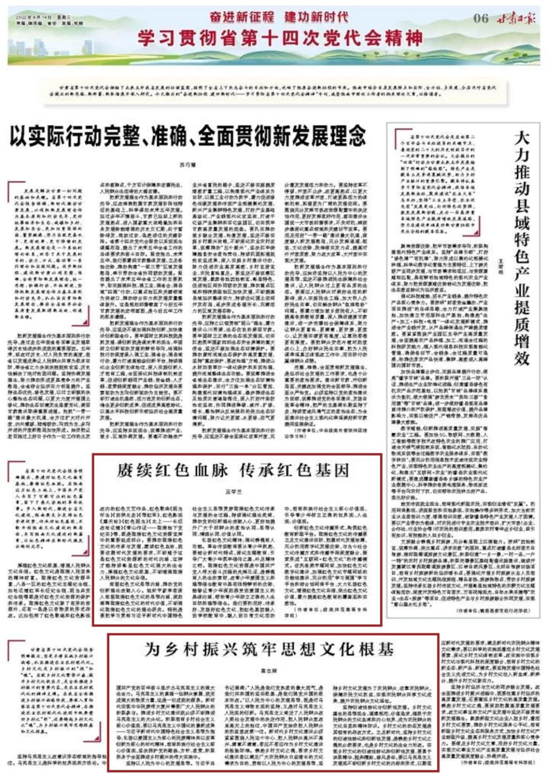 甘肃省第十四次党代会报告明确提出,坚定不移实施乡村振兴战略,扎实推进农业农村现代化。乡村文化是乡村振兴的“根”和“魂”。实现乡村文化繁荣兴盛、提升乡村文化软实力,是全面推进乡村振兴的重要内容,是农业农村现代化的精神支撑。在我省全面推进乡村振兴战略阶段,要深入贯彻落实省第十四次党代会精神,在推进农业农村现代化进程中既要塑好乡村之“形”,还要铸起乡村文化之“魂”,为乡村振兴筑牢思想根基和文化根基。