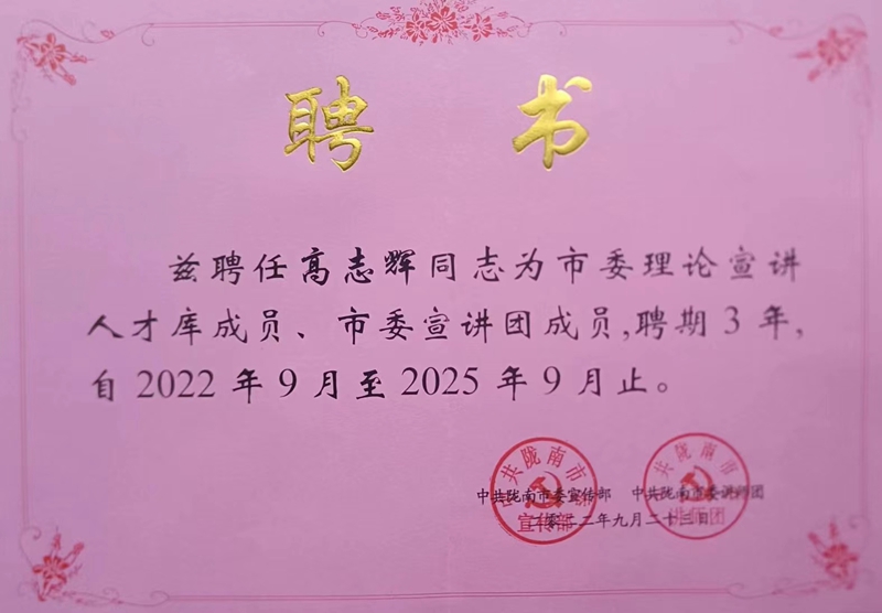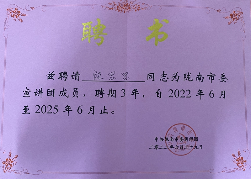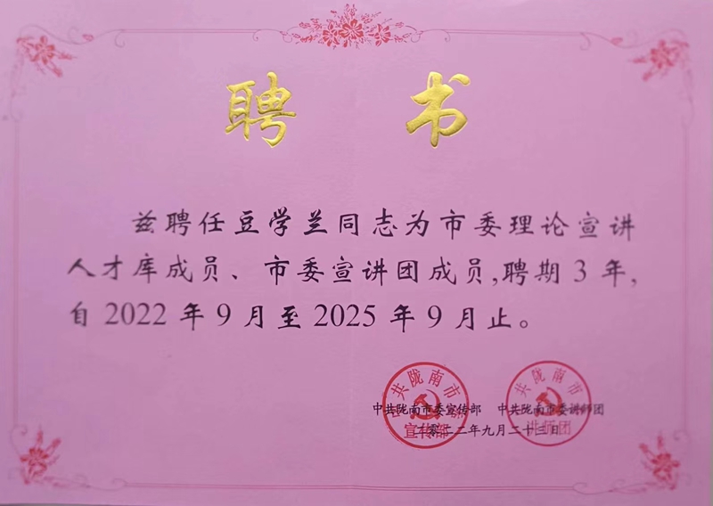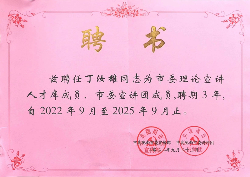 近日,中共陇南市委宣传部、中共陇南市委讲师团发布了《关于聘任张雷雨、赵祺伟等64名同志为市委理论宣讲人才库成员的通知》和《关于聘任张雷雨、张妍玲等101名同志为市委宣讲团成员的通知》,XC体育教师高志辉、豆学兰和丁汝雄等3名教师受聘为市委理论宣讲人才库成员、市委宣讲团成员,聘期三年,自2022年9月至2025年9月。此前,公司教师陈思思在全市理论大赛中荣获二等奖后,即受聘为市委宣讲团成员,聘期三年,自2022年6月至2025年6月。