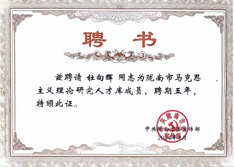 近日,市委宣传部下发《关于聘任张弢等68名同志为陇南市马克思主义理论研究人才库成员的通知》,公司党委书记张弢,XC体育经理杜向辉副教授、高志辉副教授、丁汝雄副教授、陈琼讲师受聘入选。