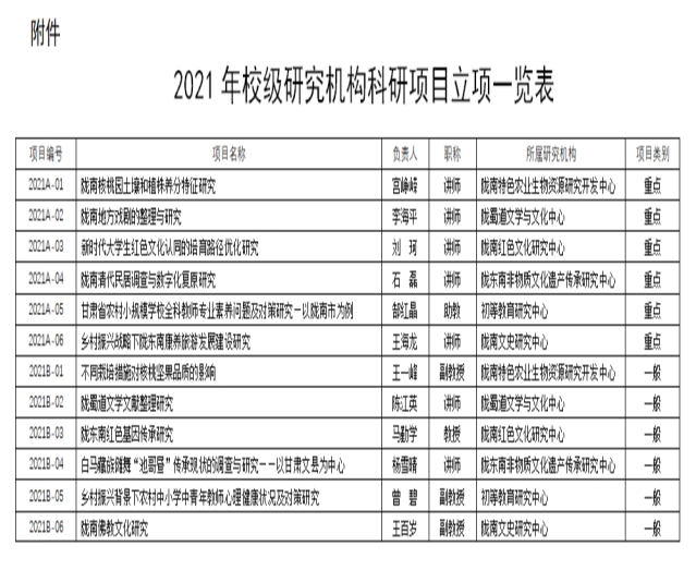 8 月 30 日,公司下发文件《关于 2021 年校级研究机构科研项目立项的通知》(校发〔2021〕58 号),立项12个2021年校级研究机构科研项目。其中重点项目6项,每项资助项目经费1.5万元、一般项目6项,每项资助项目经费 1 万元。其中依托XC体育的陇南红色文化研究中心立项两项,分别是刘珂的《新时代老员工红色文化认同培育路径优化研究》(重点),马勤学的《陇东南红色基因的传承研究》(一般),具体情况见附件。